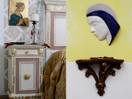 A ricordo dell'angolo della preghiera, mai assente nell'epoca di riferimento, si è deciso di scegliere dipinti in legno fiorentino e di dedicare un piccola mensola alla Madonna.